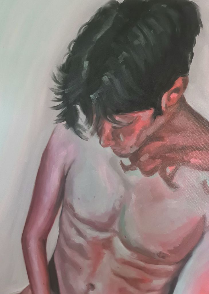 Eventually, the currents ease and I am able to break free, chugging along very slowly, before coming to a gentle halt again, as my propeller starts kicking up silt and the bow drifts over to the shallow edge. A group of three elderly(-ish) women are standing near the front of the boat having a good stare in through my window. They then approach me. I suspect that they will be making a comment about the unfortunate situation I find myself in. I am surprised that they are in fact here to compliment my most recent painting, still drying on my easel. They are very impressed and ask if it is me in the picture. I gingerly reply, “yes”. This is uncomfortable because I have been experimenting with different subjects of late and my most recent painting is a nude.