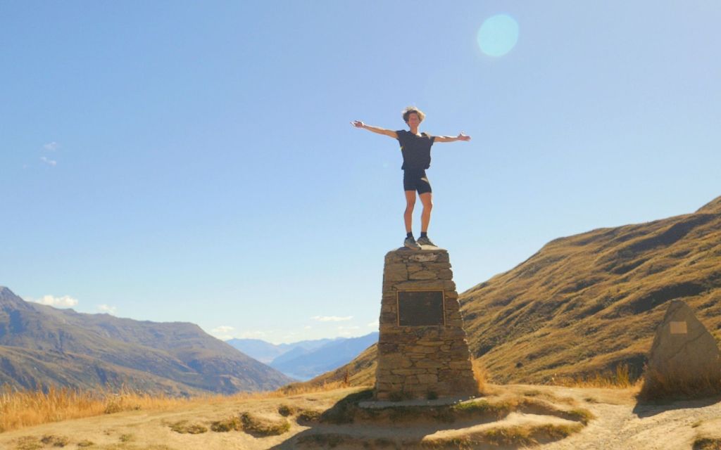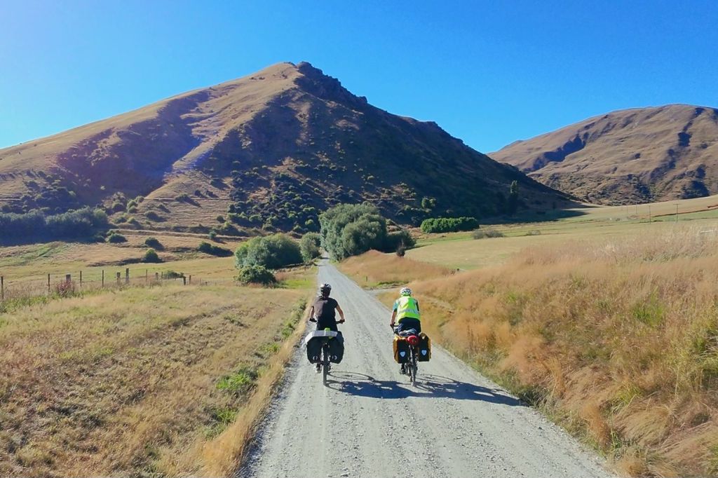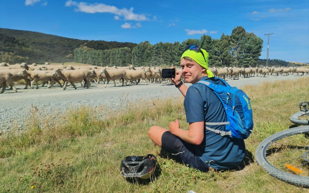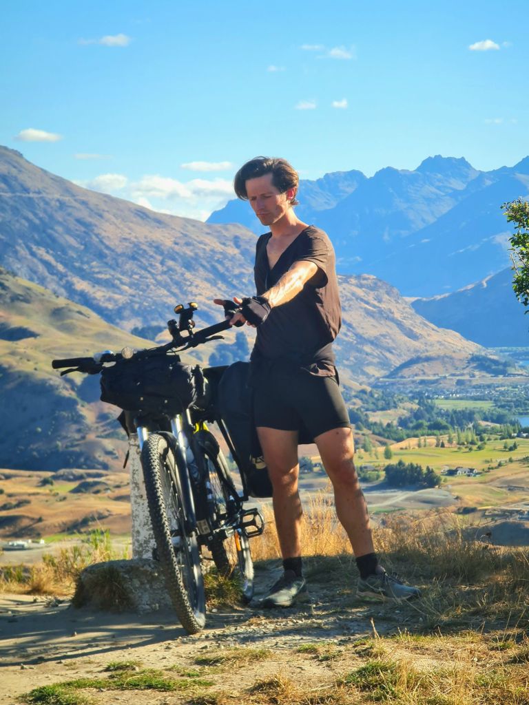 Despite being two sleep-deprived idiots, we have each retained just enough energy to take in the scenery on this last off road trail. The opening stretch is truly beautiful. We cycle along the perimeter of the lake with mountains lining the horizon. This is a different world to one month ago, when we were cycling along 90 Mile Beach. As always, I am impressed by New Zealand. We cross a river and begin the climb up to our final high point of the trip, Von Hill. It’s all downhill from here. Triumphant to have made it here before midday, we take a rest and get chatting with our e-bike buddies who have stayed here to enjoy the view.