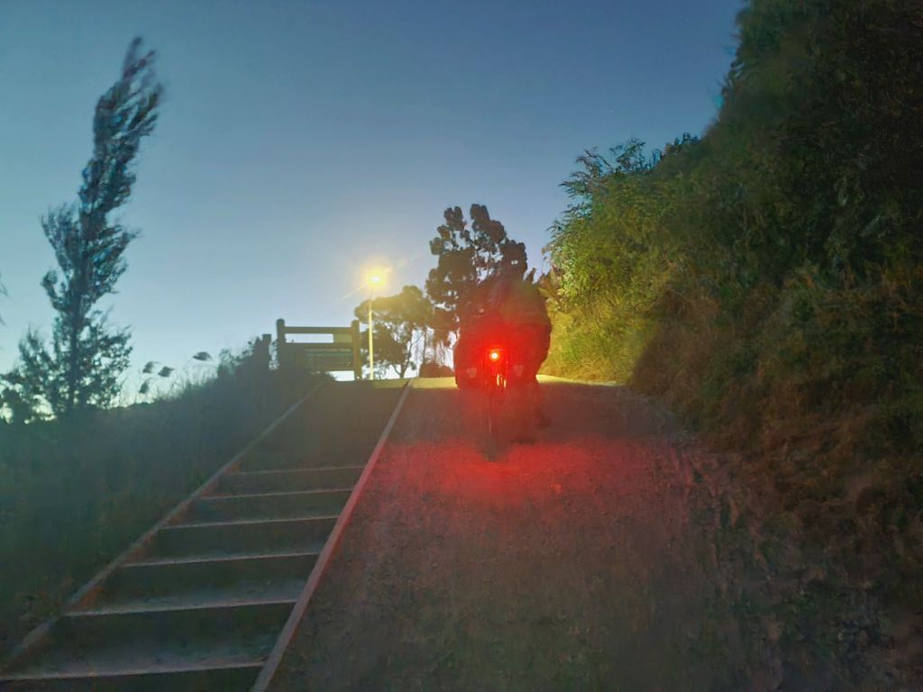 The sun sets and we continue in the darkness along the gravel. I catch something of a second wind and am able to keep up with Will. Good thing too, his bike lights are brighter than mine. I hear him ahead protesting and groaning occasionally and then find my face being ransacked by a cloud of sandflies. He has become something of a siren, warning me when to squint my eyes.