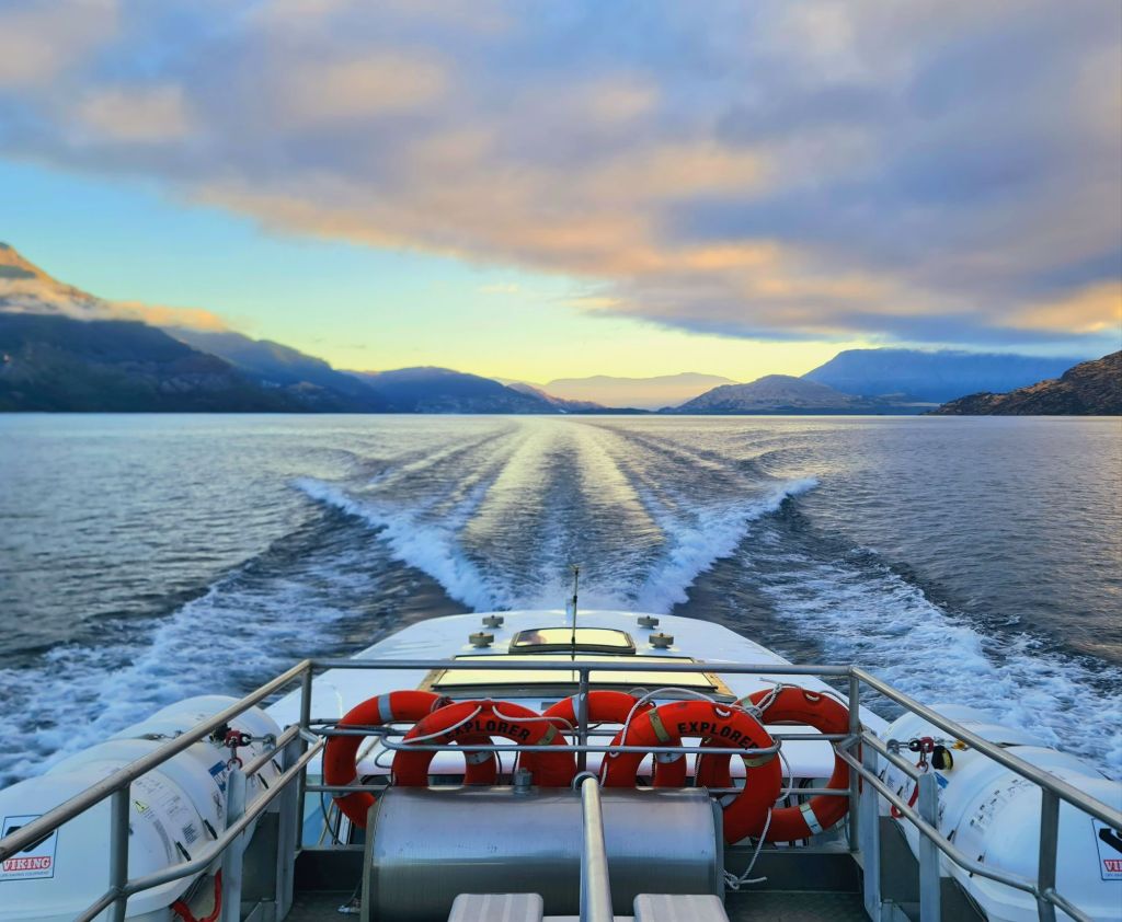 It is 24th February. This is the last big trail of the trip. My alarm goes off and I perform a stealthy exit as not to disturb the slumber of the gap year kids. I meet Will at the bike storage and we head up to reception and cycle onto the marina. We are excited to arrive at an epic steam boat, with exhaust already billowing from the funnel. Our first disappointment of the day is that this is not our boat. This boat doesn’t leave until 9am and we need more cycle time than that, so we are on the earlier and cheaper staff boat just next to it. This is still a fun experience and we are allowed to head onto the deck to enjoy the views of the mountains (provided we can tolerate the wind).