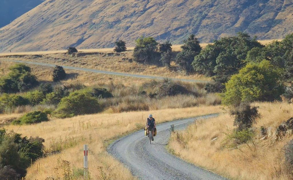 We then take a detour to the Four Square in Arrowtown and I drink a litre of cranberry juice. We are both pretty smashed at this point. That hill took away our energy. We have over 30km left to do today and it is all on gravel cycle track. Also, it’s nearly 7pm. I have accepted that we will be riding into the darkness tonight. We mount our bikes and embark on yet another river trail. This one is beautiful, all the more so during the sunset light, but I have hit the wall. I just about manage to enjoy the views as I trail behind Will up the ascents. He feeds me sweets in the hope that the easy to digest sugar will fuel me through this last section. If we didn’t have a ferry booked at 7am tomorrow from Queenstown, I’d be tempted to give up and camp here tonight. It isn’t sensible cycling when tired. I’ve been going a bit delusional of late. Two days ago, having spent a long period staring straight along the road, I then looked down at the ground and mistook my handlebars for a bird swooping underneath me. At that point, Will insisted I have some sugar.
