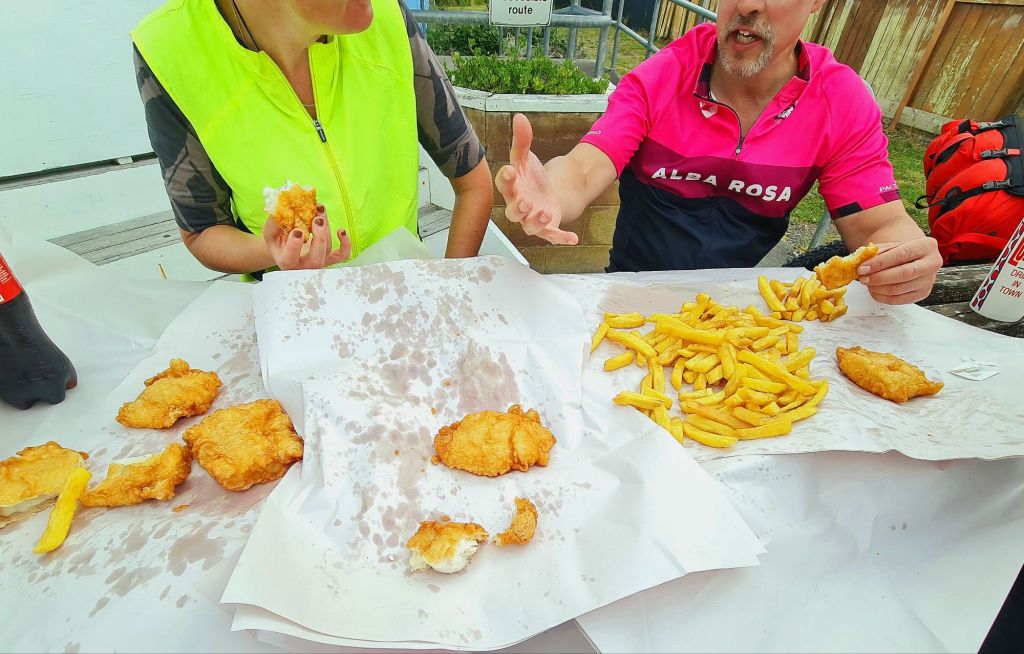 We leave Alex and Cliff’s and within seconds my chain comes off and then two minutes later, I realise my bike seat has gone crooked. I’m obviously becoming a mess. I sort myself out and we turn left to the hill. In the distance, another high vis (it’s good that these things are working). It’s Ash! We pedal on and find Andy ahead too. Convergence, yet again. We now have our team of four riding buddies. With two months to complete the journey, I am surprised Ash and Andy have pedalled this far, but then I learn why. We are on course for Kaiaua, which is famous for its fish n chips. Everyone has a common goal now. Fish n chips for dinner. Though, with last orders at 6:45pm and a good 30km separating us, we had better get a wiggle on.
