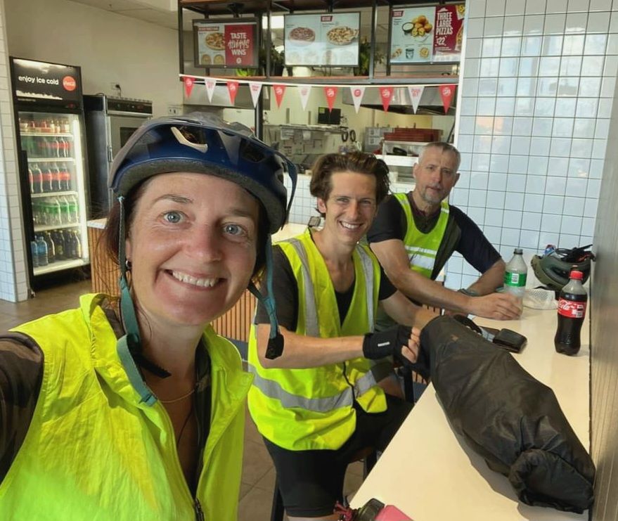 It’s Wednesday. I wake up in the luxury of an AirBnB for a change and enjoy the breakfast bits they’ve put out. I’m taking it slowly today as the course guide recommends starting after 9am to avoid traffic. I pull onto the road and leave Helensville. The day starts with rolling hills, as is typical of New Zealand it would seem, with the sun already making sweat drip from my forehead. Following about two hours of pedalling, I see a high vis in the distance. Who’s that? Is it one of me? I pedal harder to catch up. Fortunately, they have stopped for a rest. To my delightful surprise, it’s two people – Sherree and Markus, my Dargaville buddies. We’ve converged. In high spirits, we then continue our ride together, passing Janet and Aaron along the way. Whilst they tuck into the local cuisine, we decide to stop off at Pizza Hut. This is not a proud moment, but filling three hungry cyclists for 22NZD can’t be argued with.
